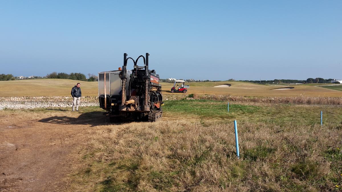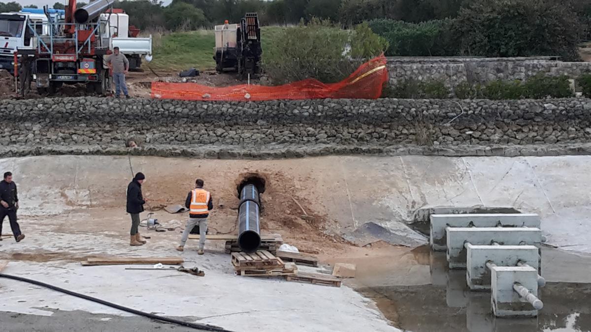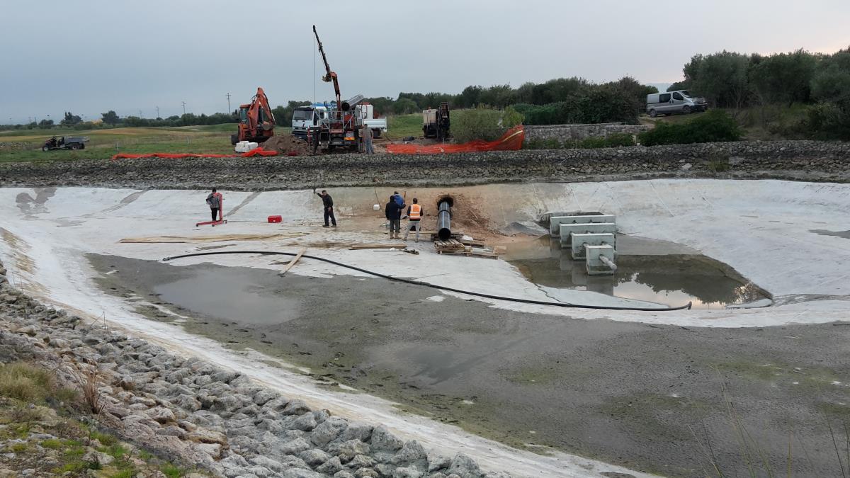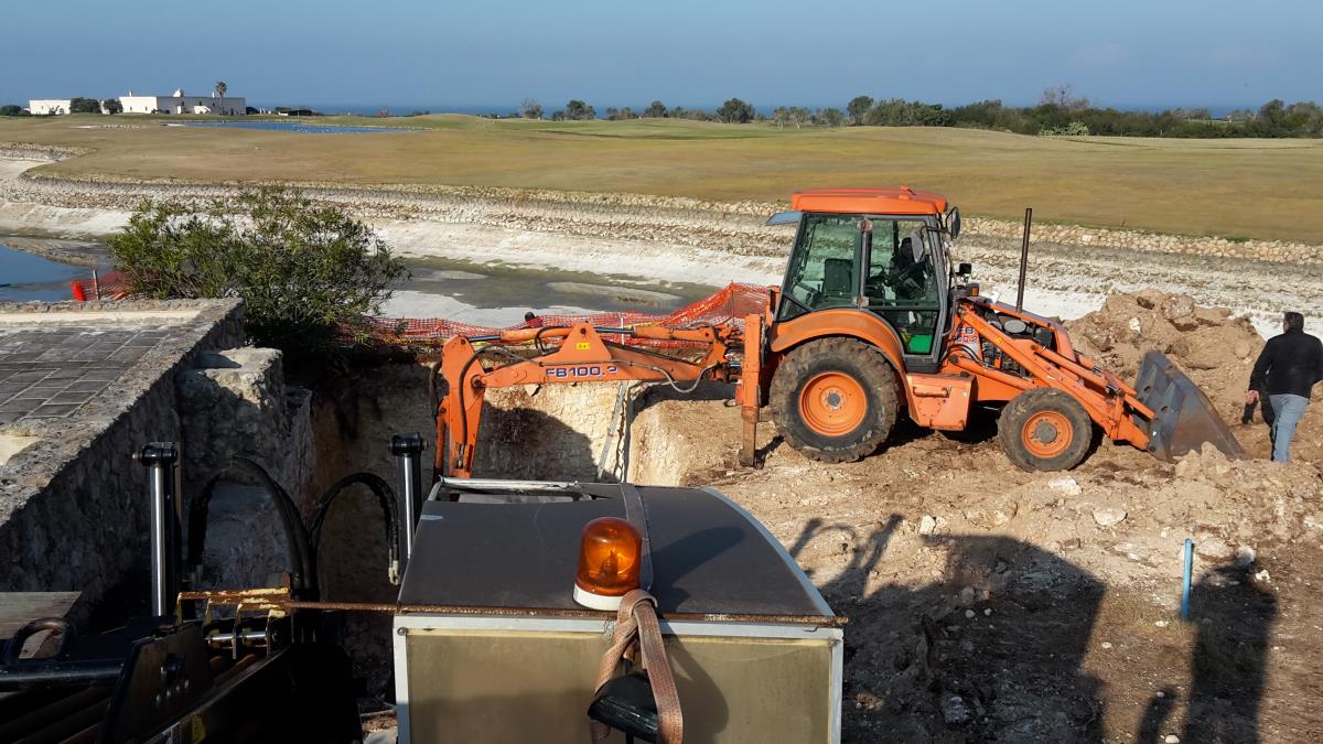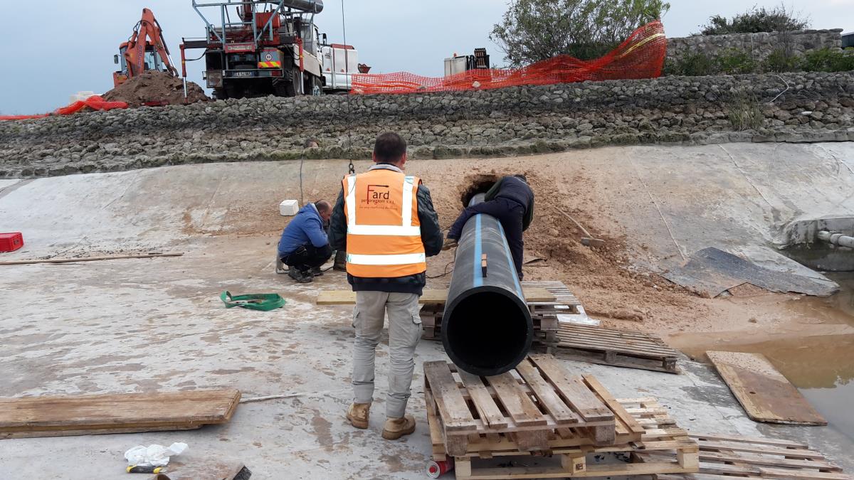 Posa di tubo in pead del diametro di 500 mm per collegare un laghetto artificiale con una vasca di compensazione e locale pompe